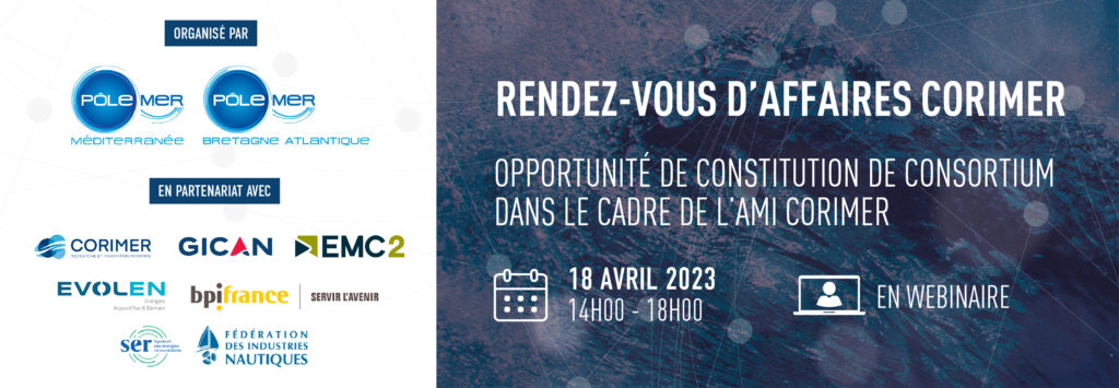Dans le cadre de l’Appel à Manifestation d’Intérêt 2023 du CORIMER, les Pôles Mer Méditerranée, EMC2 et Bretagne Atlantique, en partenariat avec la Filière des Industriels de la Mer constituée par le GICAN, EVOLEN, le SER et la FIN, et en présence de Bpifrance, vous proposent une opportunité pour constituer vos consortiums de projets afin de répondre aux enjeux des quatre axes stratégiques de l’AMI.
