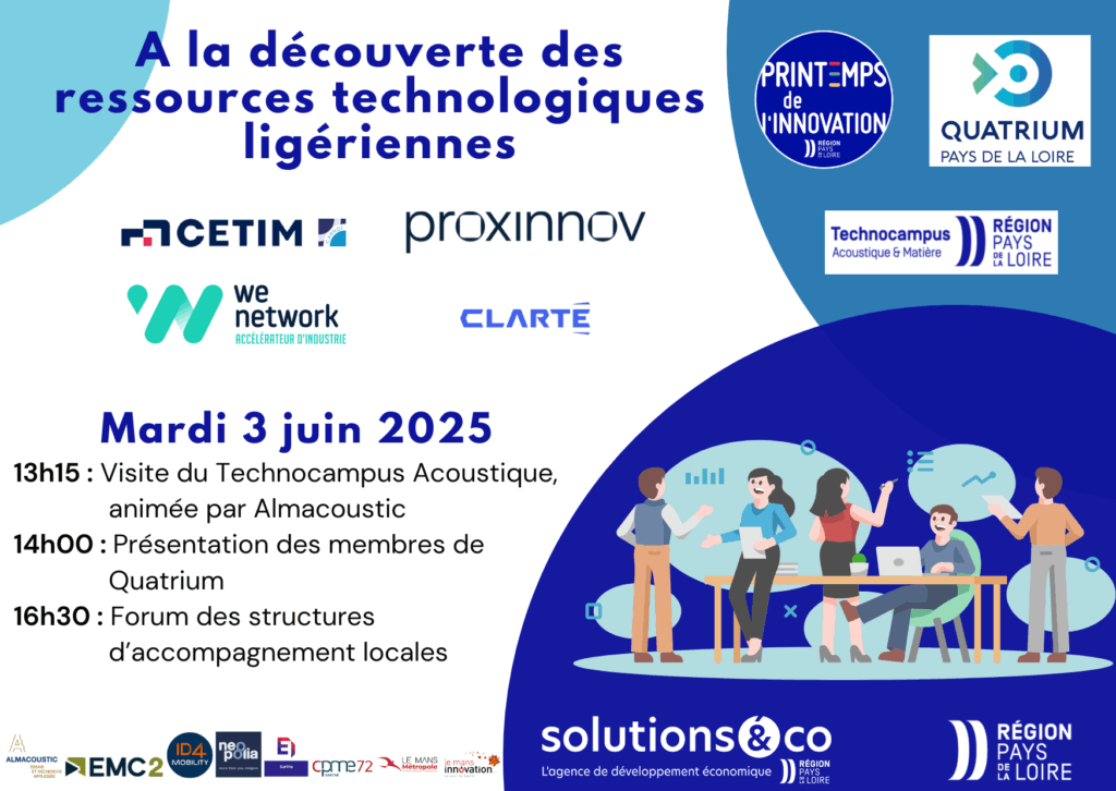 Industries du futur, vous voulez transformer une idée en action ? Vous ne savez pas sur quelles ressources technologiques vous appuyer ? Venez découvrir Quatrium Pays de la Loire (le regroupement de quatre Centres Techniques Régionaux ligériens : le Cetim, Clarté, Proxinnov et WeNetwork) et échanger avec les partenaires présents le mardi 3 juin 2025 à 14h au Technocampus Acoustique du Mans