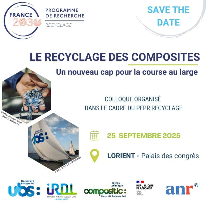 Ce colloque est organisé par l’Université Bretagne Sud (IRDL et plateau technique ComposiTIC) dans le cadre du projet RecyComp dont le but est d’imaginer de nouvelles générations de composites à matrice organique (CMO) recyclables à partir de matières premières de recyclage.