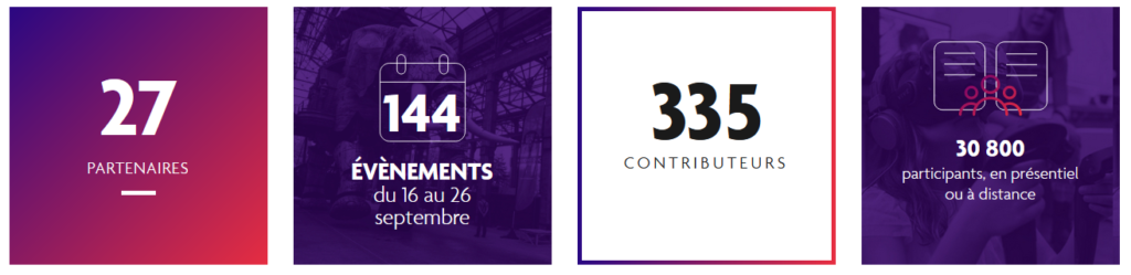 Chaque année, une centaine d’événements sont organisés pendant les 10 jours de la manifestation en septembre. Au programme : des conférences, des ateliers, des expériences immersives, des innovations à découvrir ! À travers leurs événements, les contributeur·rice·s nous aident à comprendre les mutations numériques, en cours, apportent des réponses et expérimentent des solutions.