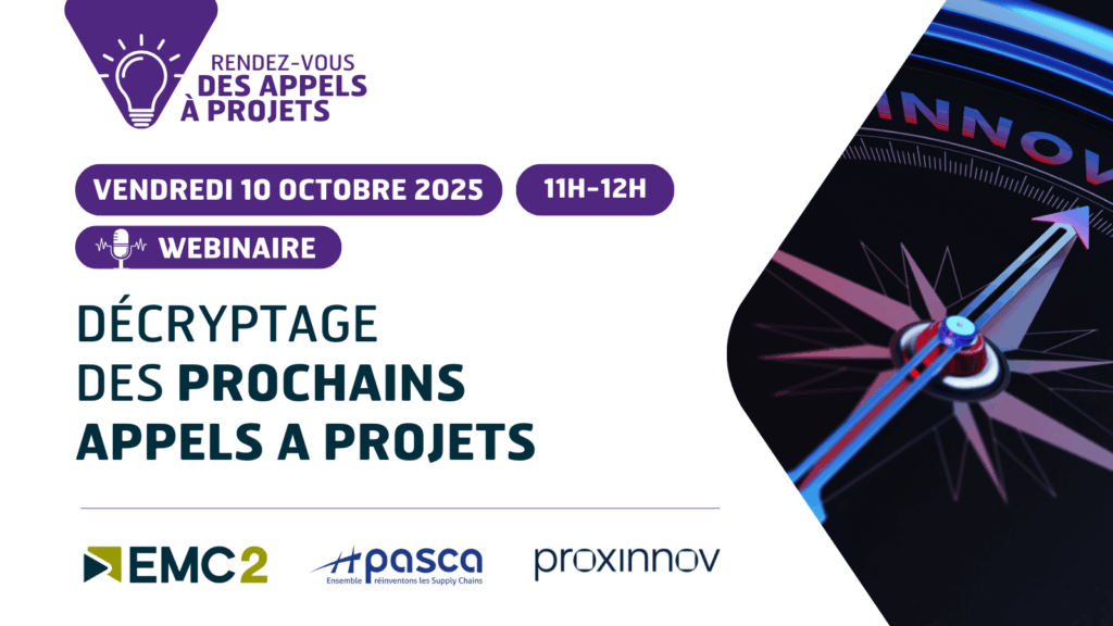 Le Pôle EMC2 vous accompagne dans le dépôt de vos projets. Le vendredi 10 octobre, EMC2 et ses partenaires Proxinnov et PASCA, décrypteront les prochains appels à projets lors d’un webinaire dédié.