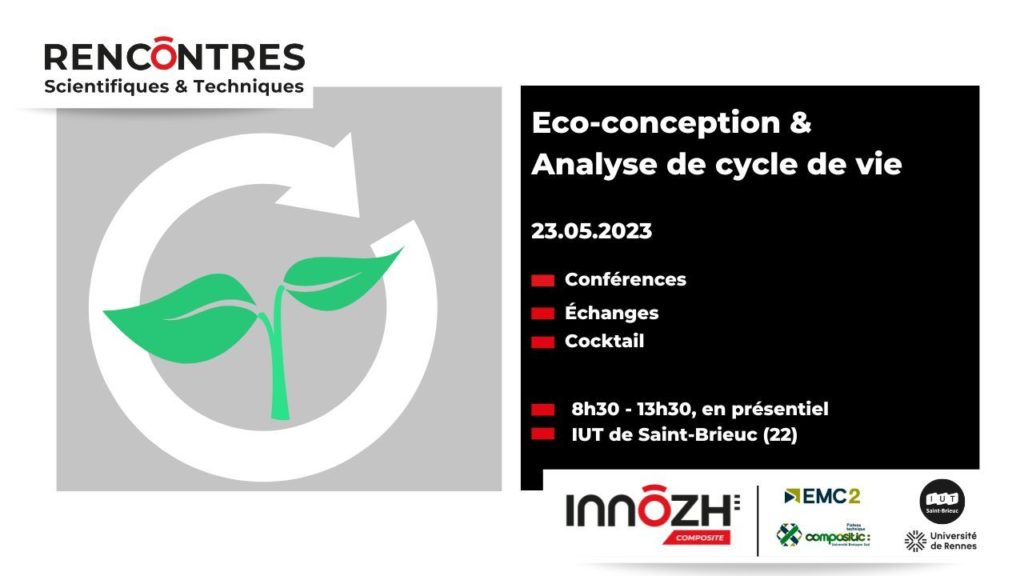 Innôzh Composite vous donne rendez-vous jeudi 23 novembre pour une Rencontre Scientifique & Technique autour de l’éco-conception et l’analyse de cycle de vie, en partenariat avec l’IUT de Saint-Brieuc Université de Rennes, le Pôle EMC2 et ComposiTIC.