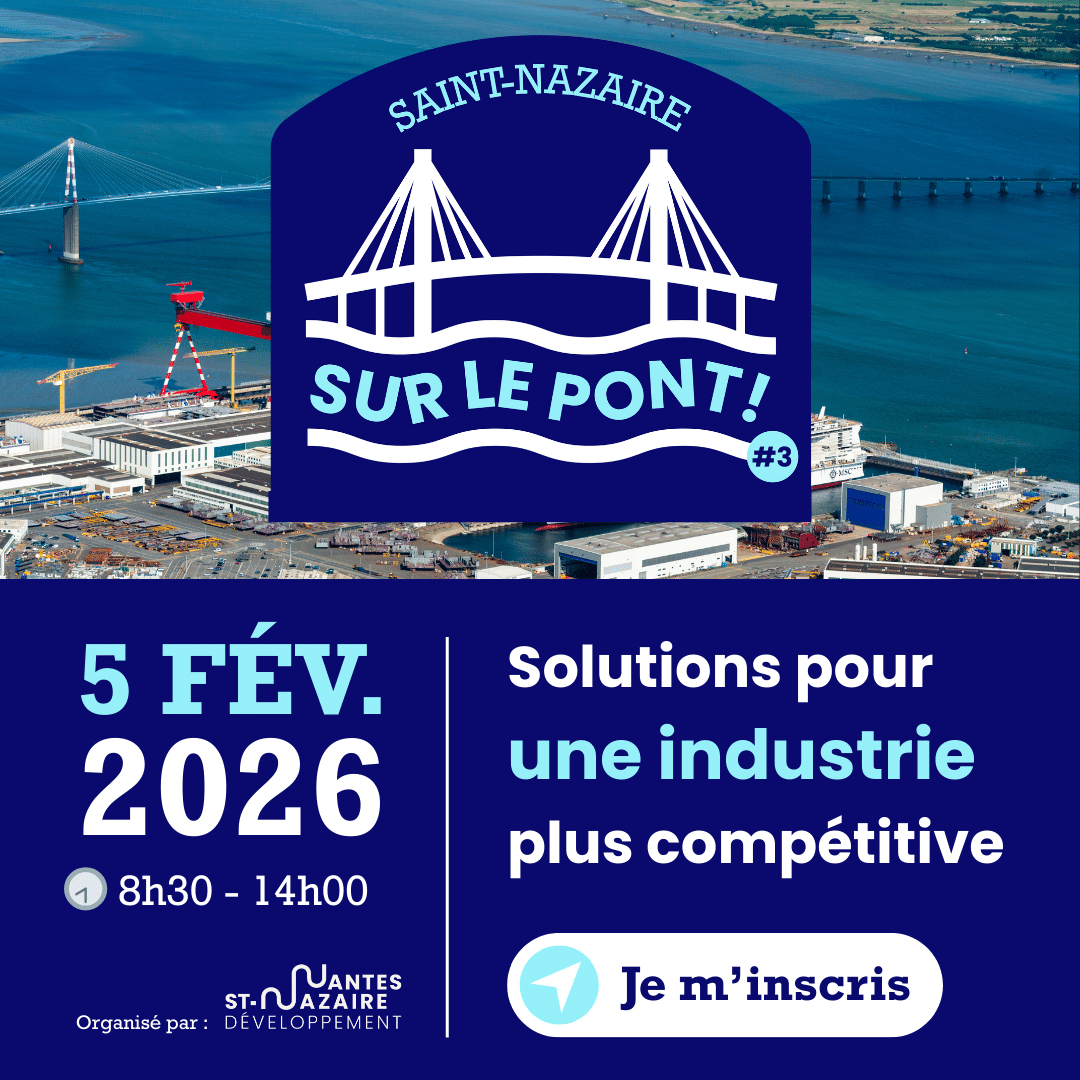 Participez à la 3ᵉ édition de “Sur Le Pont” ! Témoignages d’acteurs engagés, perspectives industrielles du territoire et projets collaboratifs entre industriels et entreprises innovantes : découvrez ce qui se construit à Saint-Nazaire et repartez avec des leviers concrets pour booster votre activité.