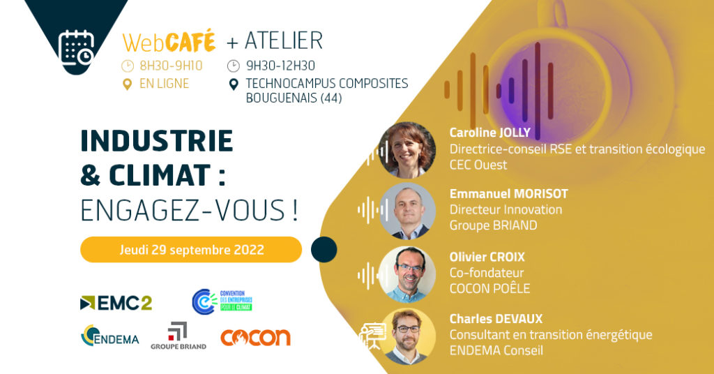 Le Pôle EMC2, la CEC Ouest, le groupe BRIAND et la marque COCON interviendront pour vous présenter les enjeux de la Convention des Entreprises pour le Climat lors d’un webinaire de 30 min, suivi d’un temps d’échanges. A l’issue du WebCafé, un atelier Fresque du Climat, animé par la société ENDEMA, vous sera proposé dans les locaux du Technocampus Composites.