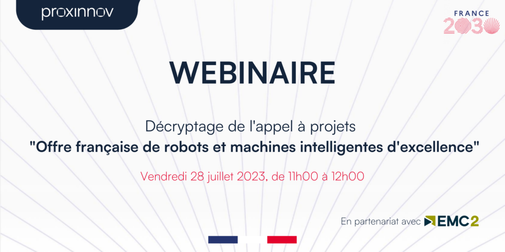 Dans le cadre de France 2030, l’Etat lance un appel à projet pour développer l’offre française de robots et de machines intelligentes d’excellence. Proxinnov et le pôle EMC2 s’associent pour vous présenter un webinaire afin de décrypter cet appel à projet !